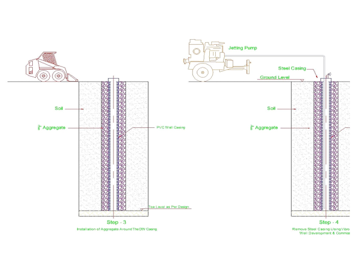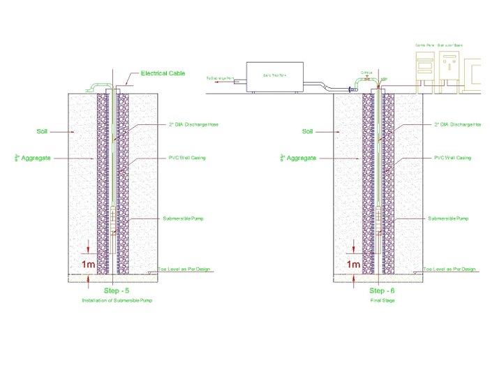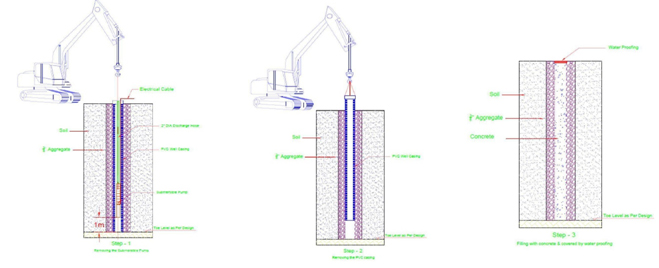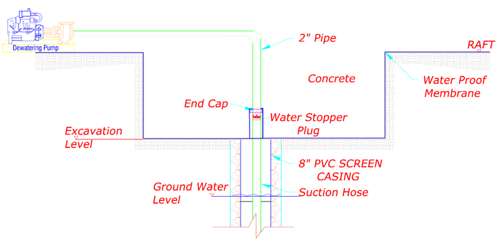 Once the hydrostatic force has been overcome by the weight of the proposed structure, the deep wells shall be stopped one by one and covered with enough time to facilitate the concreting & water proofing of the raft foundation openings as per structural contractor’s design, the submersible pumps will removed from the well and all the other misc.