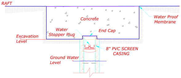 Once the hydrostatic force has been overcome by the weight of the proposed structure, the deep wells shall be stopped one by one and covered with enough time to facilitate the concreting & water proofing of the raft foundation openings as per structural contractors design, the submersible pumps will removed from the well and all the other misc. then crane needs to remove the PVC casing from the well and fill it directly with concrete and covered with water proofing as per contractor design.